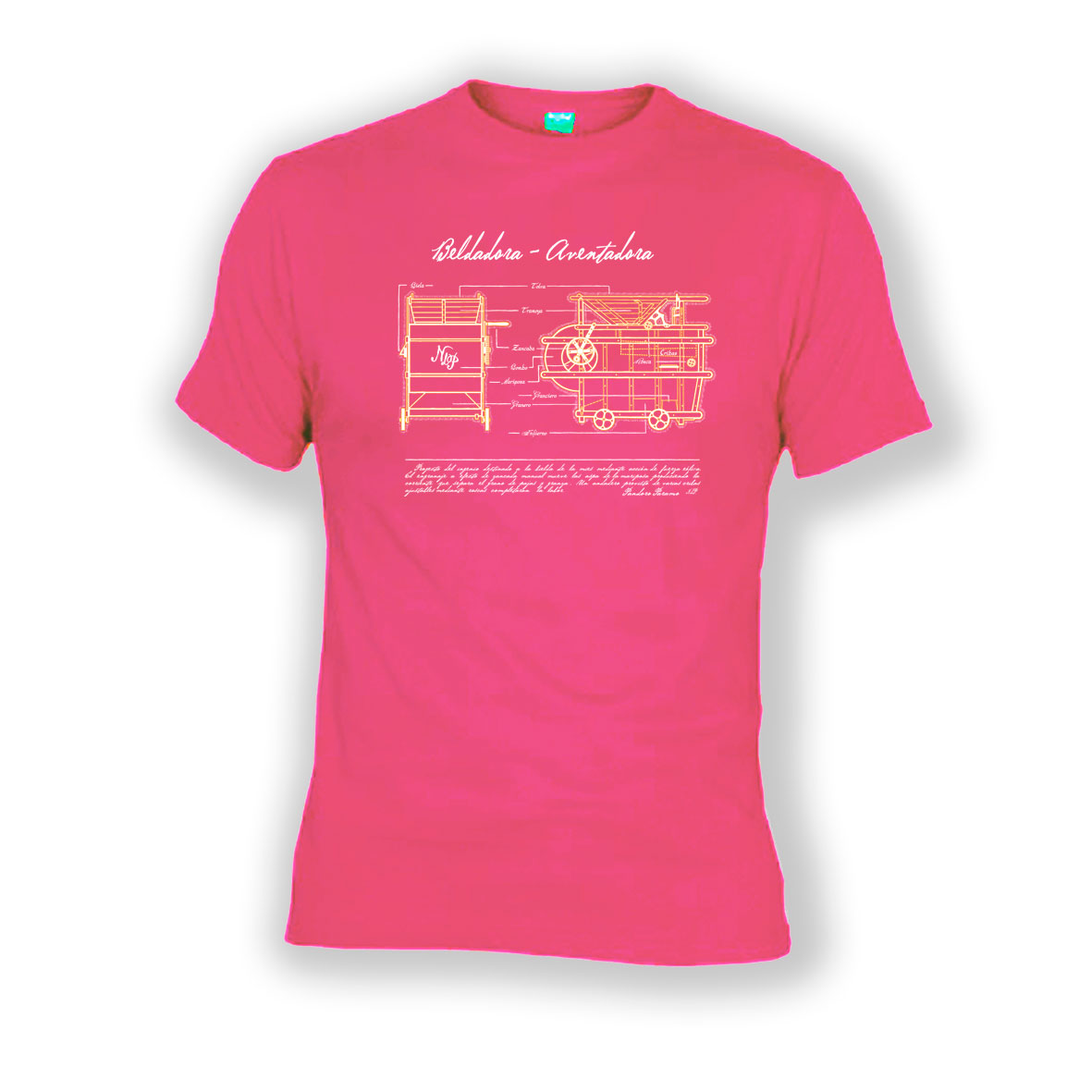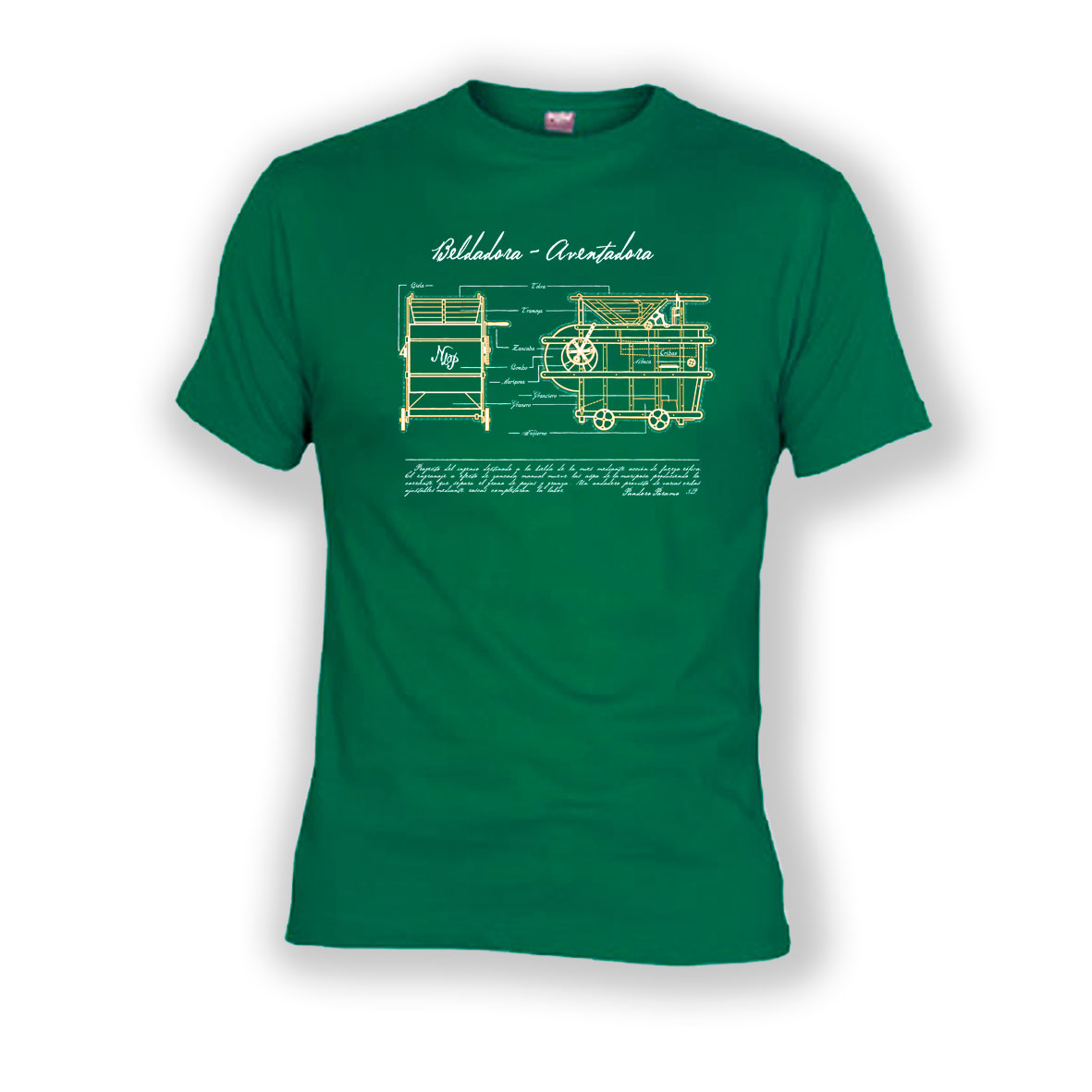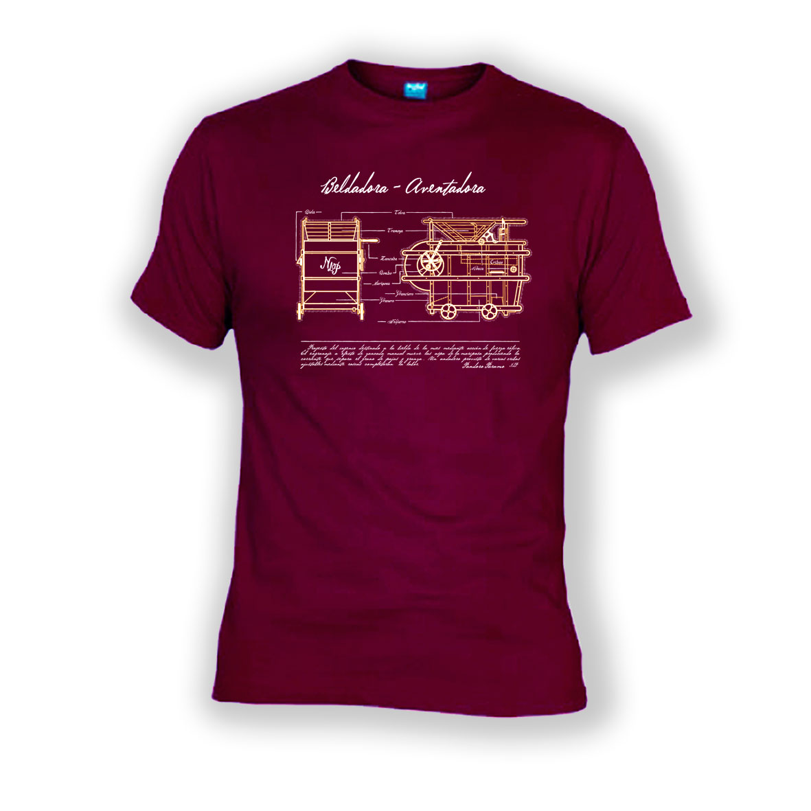 Proyecto del ingenio destinado a la bielda de la mies mediante acción de fuerza eólica. El engranaje a efecto de «zancada» manual mueve las aspas de la «mariposa» produciendo la corriente que separa el grano de pajas y granza. Un andadero provisto de varias cribas ajustables mediante roscas completarán la labor»